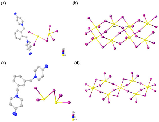 The results of X-ray single crystal diffraction for compounds 1–2 are shown in Figure 1. Compound 1 belongs to the P21/n space group in a monoclinic crystal system. The structural unit diagram of compound 1 is shown in Figure 1a, consisting of one crystallographically independent [L1]2+, and cluster anion [Pb2I6]2−. The Pb-I bond lengths range from 2.9931(5) Å to 3.3275(5) Å. Compound 2 belongs to the P21/c space group in a monoclinic crystal system. The structural unit diagram of compound 2 is shown in Figure 1c, consisting of one crystallographically independent [L2]2+, and cluster anion [Pb1.5I5]2−. The inorganic portion of compounds 1–2 is a different 1D anion chain formed by anion clusters connected to each other by I-Pb bonds, as shown in Figure 1b,d. Although compounds 1–2 were obtained from similar ligands under the same conditions, Pb2+ in compounds 1–2 showed different coordination modes. In compound 1, Pb2+ has only one coordination mode of five coordination, while in compound 2, Pb2+ has two coordination modes of five and six coordination. So the cationic ligands L1 and L2 exhibit different template effects.