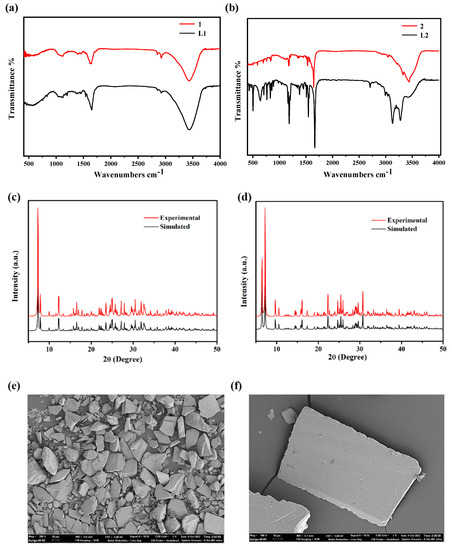 Fourier-transform infrared (FT-IR) spectra were used to study the functional groups of compounds 1–2. The FT-IR spectrum of the synthesized ligands L1–L2 and compounds 1–2 is distinctly revealed in Figure 2a,b. The characteristic peaks of compounds 1 and 2 are consistent with the corresponding ligands (L1–L2). The broad peak at nearly 3420 cm−1 corresponded to the N-H stretching mode, and the signal peaks appearing around 1675 cm−1, 1587 cm−1, and 1456 cm−1 were attributed to the stretching vibration of the aromatic ring. In addition, the signal peaks present around 2950 cm−1 are vibrational stretching peaks with saturated C-H. Powder X-ray diffraction (PXRD) patterns of compounds 1–2 were recorded and compared with the simulated single-crystal diffraction data in order to affirm the purity of the compounds. As shown in Figure 2c,d, the positions of the peaks are basically consistent with the simulated patterns generated from the results of the single crystal diffraction data, indicating the purity of products. Scanning electron microscopy (SEM) is used to study the morphology of compound 1, as shown in Figure 2e,f, compound 1 presents a regular block structure.