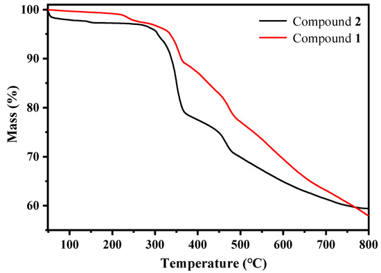 A thermogravimetric analysis (TGA) was conducted under air atmosphere conditions to test the thermal stability of compounds 1–2. The results of the TGA analysis are shown in Figure 3, and the thermogravimetric decomposition processes of compounds 1–2 were different. The thermogravimetric decomposition of compound 1 is divided into three stages. Compound 1 remains basically unchanged from room temperature to 250 °C. The mass loss between 250 and 320 °C can be attributed to the decomposition of organic cations; the mass loss between 320 and 800 °C may be caused by the collapse of the inorganic anion skeleton. In addition, the thermogravimetric decomposition of compound 2 is divided into four stages. Compound 2 remains basically unchanged from room temperature to 300 °C. The mass loss between 300 and 360 °C can be attributed to the decomposition of organic cations; and due to the fact that Pb2+ in compound 2 has two coordination modes of five and six coordination, the mass loss between 360 and 470 °C and 470 and 800 °C may be caused by the collapse at the different inorganic skeletons with different Pb2+ coordination environments. It can be found that compound 2 is more thermally stable than compound 1.