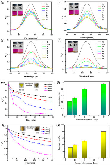 (a) Uv-vis spectrogram and color change of iodine solution when 10 mg compound 1 is added; (b) Uv-vis spectrogram and color change of iodine solution when 20 mg compound 1 is added; (c) Uv-vis spectrogram of and color change iodine solution when 40 mg compound 1 is added; (d) Uv-vis spectrogram and color change of iodine solution when 80 mg compound 1 is added; (e) Effect of different compound 1 dosages on iodine degradation; (f) Removal rate of iodine degraded by compound 1; (g) Effect of different compound 2 dosages on iodine degradation; (h) Removal rate of iodine degraded by compound 2.