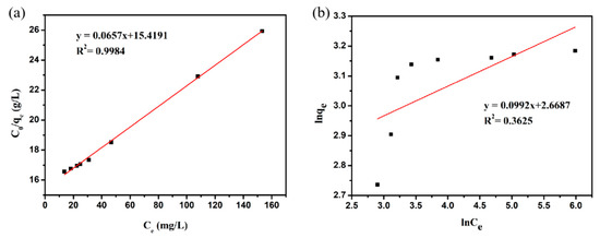 where qm is the maximum adsorption capacity (mg·g−1) of the adsorbent; K1 is the Langmuir adsorption constant (L·mg−1); K2 is the Freundlich adsorption constant (g·mg−1·min−1); n is a constant that characterizes the surface heterogeneity, and constant is always greater than 1.