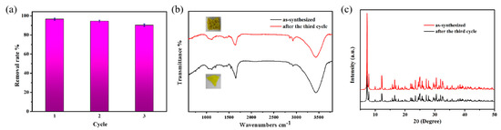 The recyclability of materials is an important criterion to evaluate whether materials have application value. After the removal of iodine by adsorption with compound 1 each time, the adsorbent was collected, and then anhydrous ethanol was used as the clean solution to remove the adsorbent. The collected adsorbent was put into fresh iodo-cycloethane solution to start a new cycle. In the cycle experiment, all experimental conditions are exactly the same as in the first cycle experiment. After three times of adsorption-desorption experiments, the results are shown in Figure 8a; the removal efficiency can still reach 90.27% after the third cycle (96.59% in the first round). For a small decrease in removal rate, it can be assumed that a small number of active sites are incompletely resolved. The removal rate of iodine from compound 1 remained high after each cycle. In addition, the adsorbent was characterized by FT-IR and PXRD after three cycles. As shown in Figure 8b,c, compared with fresh samples, FT-IR peaks before and after the adsorption reaction showed almost no difference. The intensity of the characteristic peaks of PXRD decreased to different degrees, but the characteristic peaks were still observed, which was speculated to be due to the adhesion of iodine on the surface of the adsorbent after adsorption. In conclusion, compound 1 has good recyclability and has objective application prospects.