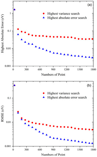 It can be seen from Equation (5) that predicting the potential energy of an unknown configuration by a GP PES requires the covariance matrices between this new geometry and all of the training data, and the product of the n-dimensional vector-vector is required to calculate. Therefore, to evolute a GP PES becomes difficult with an increase of training data, and the subsequent dynamics calculations are limited significantly. Therefore, for precision, it is crucial to effectively reduce the number of training points for constructing a reactive PES with the GP model. Here, two active learning schemes, namely the highest variance search and highest absolute error search, are compared to automatically select the training data in the process of representing the global ground-state LiNa2 PES. We sample 30 molecular configurations using the Latin hypercube approach [74] and calculate the corresponding energies as the initial database, and a total of 13,453 ab initio points that cover the entire coordination space are selected as the test database. The test database serves two purposes: providing the candidate data to be added to the training database and testing the generalization performance of the resulting GP PES. First, a rough GP PES is structured using the initial database, and the predictive variances and absolute errors of all the test data points are calculated by this initial PES. The point with the highest variance or absolute error is removed from the test database and added to the training database. The training set is circularly updated until the highest absolute error converges to the set energy value, and the final GP PES is determined simultaneously.