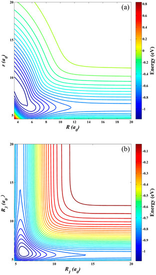 Figure 3a,b displays contour plots of the ground-state LiNa2 PES at C2v and D∞h symmetries, respectively. For Figure 3a, there is a well with the lowest energy value of −1.24 eV at r = 7.78 a0, R = 4.78 a0, and it is also the equilibrium geometry of the ground-state LiNa2 system. At low temperatures or ultracold conditions, the Li atom slowly moves along the midperpendicular of the Na2 molecule with the remarkable elongation of the Na–Na bond, and a Li–Na–Na complex is formed before the Na-Na bond is broken. Figure 3b shows the excellent exchange symmetry of the constructed PES about the two same Na atoms. There is a well with the depth of 1.12 eV at R1 = R3 = 5.92 a0. It is worth mentioning that no saddle point or cusp caused by the conical intersection of the first excited state is presented for the two special symmetries, suggesting that electronic non-adiabatic coupling has little effect on this reactive system.
