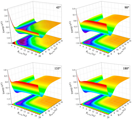 Three-dimensional diagrams and the corresponding contour maps of the ground-state LiNa2 PES at fixed Li–Na–Na angles (45°, 90°, 135° and 180°).