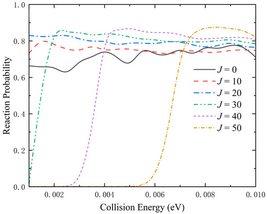 The collision energy dependence of total reaction probabilities of the Li(2S) + Na2(v0 = 0, j0 = 0) → LiNa + Na reaction at six partial waves (J = 0, 10, 20, 30, 40 and 50) are presented in Figure 7. For the curve of J = 0, there is no reaction threshold due to the exothermicity and barrierless MEP. Furthermore, it exhibits relatively smooth oscillations, which is because the well on the global MEP can support bound and quasi-bound states, and the intermediate LiNa2 and quantum resonances are formed. With the increase of the J value, the reaction threshold appears, and the resonance structures gradually disappear since the increasing centrifugal potential barrier reduces the depth of the effective potential well. The increase of threshold and the convergence of reaction probabilities are relatively slow because of the large, reduced mass of the Li + Na2 system.