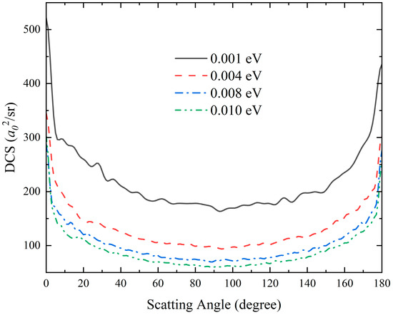 To present the dynamics mechanisms more intuitively, based on the features of the angular distributions of the product molecules, Figure 9 presents the total DCSs of the product LiNa molecule of the Li(2S) + Na2(v0 = 0, j0 = 0) → LiNa + Na reaction varying with the scattering angle at four collision energies (0.001, 0.004, 0.008 and 0.010 eV). It can be seen that the peak values of the DCS curves are located at the two extreme angles (0° and 180°) for each collision energy, and the scattering angular distributions are symmetric with respect to 90°, showing apparent statistical behaviors. This is because the reaction almost completely proceeds along the global MEP at such low collision energies; thus, the complex LiNa2 is formed in the potential well of the reaction path, and there is enough time to evenly distribute the forward and backward scattering product molecules. The forward-backward symmetric DCSs further indicate that the complex-forming mechanism plays a dominant role in the range of studied collision energies.