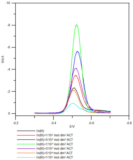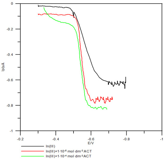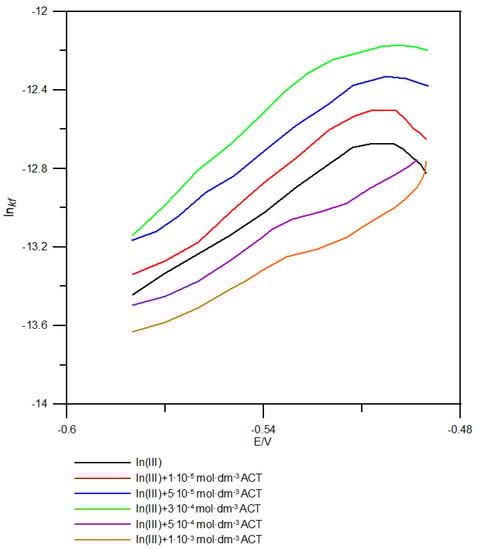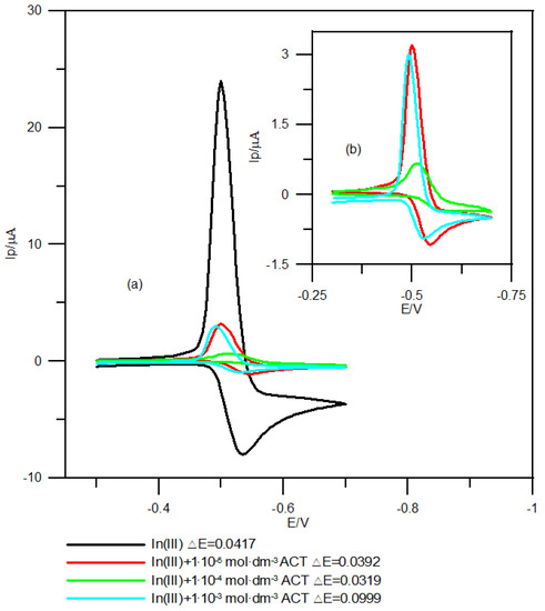 The values of ΔE (obtained from the CV curves Figure 3a,b) decrease, compared to those obtained for the basic electrolyte (1 × 10−3 mol·dm−3 In(III) in 1 mol·dm−3 chlorates(VII)). Above the ACT concentration of 1 × 10−4 mol·dm−3, a definite increase in ∆E is observed, suggesting changes in the dynamics of the kinetics of the electroreduction process towards inhibition [22].