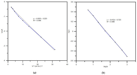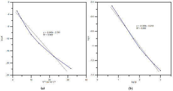 (a) Dependence of the cathodic peak current for the reduction of In(III) + 1 × 10−4 mol·dm−3 acetazolamide (Ip) on the square root of the scan rate (v1/2). (b) The log-log dependence of the reduction peak current and the scan rate over the interval from 5 to 1000 mVs−1. Each point is the average of three measurements.