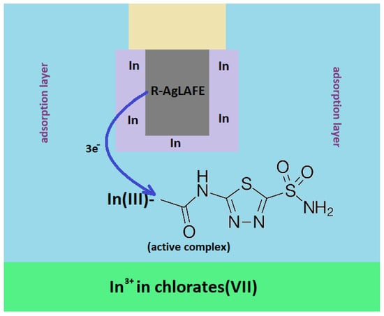 The catalytic ability of acetazolamide can be explained by the formation of the above-mentioned active complexes on the electrode surface between the ACT molecules adsorbed on it and the indium aqua complex (“cap-pair” effect). The electrode surface is the optimal area for the formation of such unstable and charge exchange-mediated complexes as a significant local ACT concentration is a result of adsorption of ACT on the R–AgLAFE electrode.