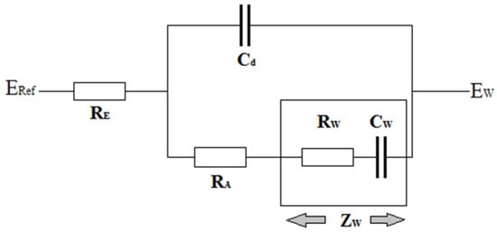 Randles’ electric al equivalent circuit diagram [33]. —reference electrode; —working electrode; —resistance of electrolyte, electrode and bonds; —differential capacity of the double layer; —activation resistance; —Wartburg impedance; —Wartburg resistance; —Wartburg capacity.
