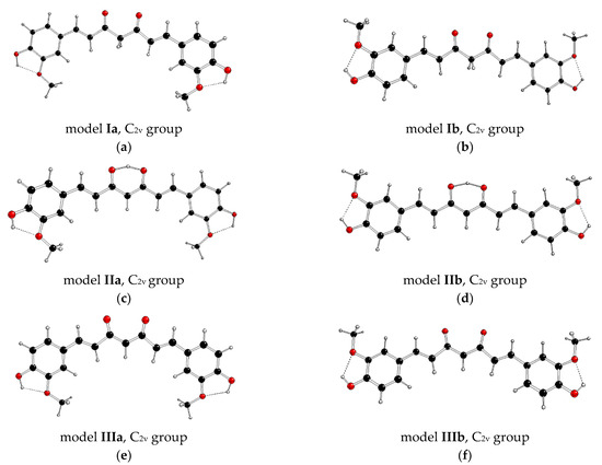 The highest identified possible structure of curcumin is that of C2v symmetry group. We studied its symmetric neutral keto–keto (I) and enol–keto (II models) forms, and anionic enolate (III) forms. PJTE is connected with a symmetry decrease, so it cannot be observed in nonsymmetric molecules (C1 symmetry group). The PJT symmetry descent Cs → C1 or C2 → C1 is too simple and often can be considered as the final parts of more complex PJTE within their C2v supergroup. Therefore, we investigate the C2v symmetry containing the alkene linker in an all-trans configuration with both 4-hydroxy-3-methoxyphenolic groups either in anti- (Ia, IIa, and IIIa models) or in syn- (Ib, IIb, and IIIb models) conformations of methoxyl and central C-O groups. Geometry optimizations of these systems began in the C2v symmetry group. Subsequently, their geometries were reoptimized within its C2, Cs, and C1 subgroups. The obtained structures are briefly presented in Table 1 and visualized in Figure 1 and Figure S1 in Supplementary materials. The electronic excited states for every optimized geometry were evaluated, and the first five lowest energy transitions are collected in Table 2. Equation (2) for PJT interaction is based on a perturbation principle, so we can suppose that the oscillator strengths f for the electron transitions between corresponding electron states in the parent group and its subgroups do not change significantly during PJT symmetry decrease. Thus, we use the f values to identify the corresponding excited states in the subgroups.
