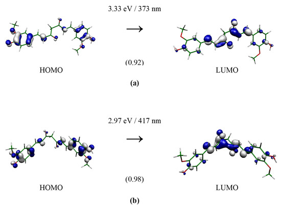 Useful information on the electronic structure of enol–keto and keto–keto tautomers could be deduced from the analysis of molecular orbitals that contribute to the lowest electronic transition with significant oscillator strength. The calculated frontier orbital distributions for the selected structures, computed at the B3LYP(SMD = water)/aug-cc-pVDZ//M062X/cc-pVDZ level with an iso-value of 0.05 atomic units, are presented in Figure 3, Figure 4 and Figure 5. In the case of keto–keto forms, the electron clouds are either delocalized only over one-half of the molecular length (see Ia) or well separated (see Ib). For enol–keto forms, the electrons are excited from the enolic part to the center. Interestingly, enolic IIIa and IIIb forms have significant differences in the shapes of the HOMO orbitals. All the depicted transitions have a π→π* character.