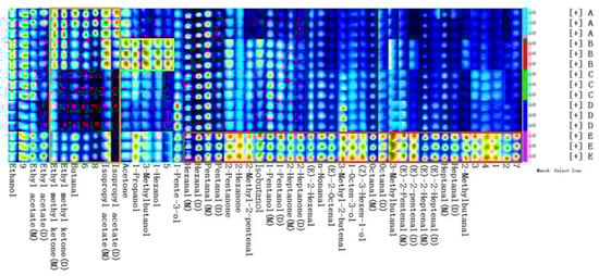 Fingerprint (gallery plot) of characteristic VOCs in walnut oil from five different varieties (A: Xin2; B: 185; C: Xinfeng; D: Xin’guang; E: Zha343).