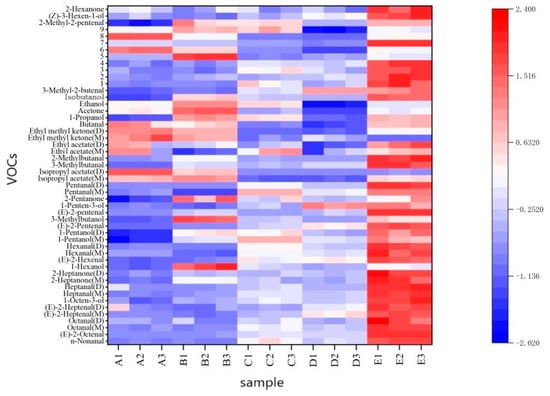 The characteristic VOC markers of the four samples were obtained using heat map analysis. Specifically, isopropyl acetate was the characteristic marker of sample A; acetone, 3-methylbutanol, and 1-hexanol were the characteristic markers of sample B; 1-penten-3-ol was the characteristic marker of sample D; fifteen substances, including pentanal and n-nonanal, were the characteristic markers of sample E; and there was no characteristic marker detected for sample C.
