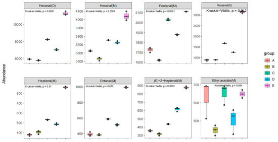 In addition, Kruskal–Wallis tests were performed to gain further insight into the distribution of the key VOCs of samples A, B, C, D, and E. Then, we derived the box plot shown in Figure 5. The relative content differences of eight key VOCs in five varieties of walnut oil can be directly compared in Figure 5. Furthermore, the distribution of the relative contents of four substances, hexanal (M), hexanal (D), pentanal (M), (E)-2-hexanal (M), in the five varieties of walnut oil presented extremely significant differences (p < 0.01). Additionally, the distribution of the relative contents of pentanal (D), heptanal (M), and octanal (M) showed significant differences (0.01 ≤ p < 0.05).