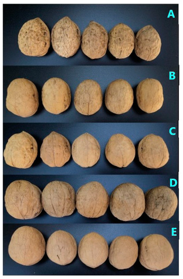 Five varieties of walnut origin from two regions of Xinjiang were collected; the information from the samples is shown in Table 3. The sampled walnut trees were planted artificially. According to the requirements of walnut cultivation technology, farm manure and pesticide were applied in key phenological periods. All the walnuts were harvested in September 2021 and preserved at 4 °C to prevent deterioration before use after peeling and drying. The appearances of the five varieties of walnut are shown in Figure 6.