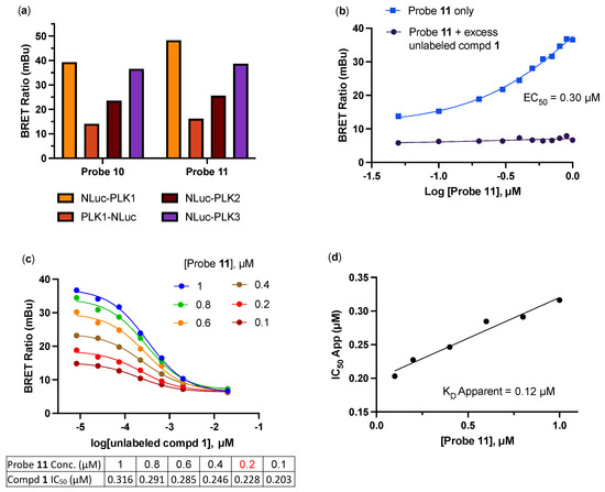 Adherent HEK293 cells in a 96-well plate expressing NLuc-PLK1, NLuc-PLK2, or NLuc-PLK3 fusion proteins were mixed with increasing concentrations of the BRET probe 11 and various concentrations of unlabeled compound 1 for 2 h before adding 3× Complete Substrate plus Inhibitor Solution. For each probe concentration used, the BRET ratios obtained were used to estimate compound 1 half-maximal inhibitory concentrations (IC50) by fitting the data to the four-parameter sigmoidal dose–response curve in Prism 9.0 (GraphPad, Boston MA, USA). To obtain the apparent in-cell binding potency (KD apparent) of 1 towards the PLK1, the linear regression of the estimated IC50 versus the concentration of the BRET probe was determined.