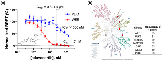 (a) Dose response of adavosertib in the PLK1 and WEE1 NanoBRET assays. Individual data points are the mean ± SE of at least three technical replicates. The light yellow shaded box shows the range of median Cmax of 225 mg adavosertib. (b) Live cell target occupancy of adavosertib at 1 µM across 192 kinase NanoBRET assays using the K10 tracer [24]. Only 7 kinases showed >50% occupancy, shown as the red dots on a kinome tree generated by KinMap (http://www.kinhub.org/kinmap/, accessed on 1 March 2023) with the % occupancy noted.