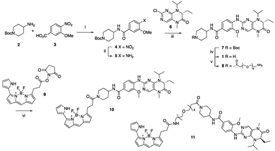 Reagents and conditions: (i) HATU, DIPEA, DMF, RT, 69%; (ii) hydrazine hydrate solution (50−60%), Raney-Nickel, EtOH, 50 °C, 97%; (iii) K2CO3, Pd2(dba)3, XPhos, t-BuOH, 120 °C, microwave irradiation; (iv) TFA, DCM, RT, 59% for two steps; (v) t-Boc-N-amido-(PEG)4-acetic acid, TBTU, DIPEA, DMF, RT, 58%; then, TFA, DCM, RT, 86%; (vi) BODIPY 576/589 NHS ester (9) DIPEA, DMF, RT, 68% for energy transfer probe 10, 70% for energy transfer probe 11.