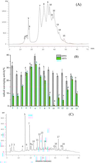 Reversed-phase chromatogram fraction II-2 and activities of each fraction: elution profile of fraction II-2 by ProntoSIL C18 ace-EPS column (A), DPPH and ABTS radical scavenging activities of 15 eluting fractions (B); elution profile of fraction II-2-6 by the analytical Cosmosil pbr column (Ø4.6 × 250 mm, 5 μm) (C), and DPPH and ABTS radical scavenging activities of 19 eluting fractions (D). different letters in the same test in (B,D) indicate significant differences (p < 0.05).