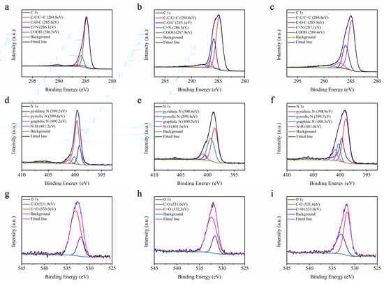 High-resolution XPS C1s (a–c), N1s (d–f) and O1s (g–i) spectra of B-CDs, Y-CDs, and R-CDs.