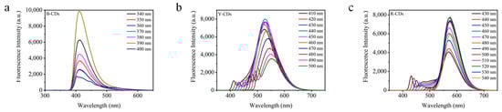 As displayed in Figure 5, the fluorescence emission spectra of B-, Y-, and R-CDs at different excitation wavelengths were measured. The emission wavelength of the Y-CDs was dependent on the excitation wavelength. When the excitation wavelength of Y-CDs transformed from 410 to 500 nm, the emission wavelength gradually shifted from 520 to 555 nm. However, the emission peak of B-CDs was mainly 410 nm in the excitation wavelength range of 340~400 nm, indicating that it was an excitation-independent emission. In the excitation wavelength range of 430~540 nm, the emission range of R-CDs was longer, and the maximum emission peak was 580 nm. Different from Y-CDs, both B-CDs and R-CDs displayed excitation-independent emission behavior, which probably depended on their homogeneous surface states. Meanwhile, the excitation-dependent FL behavior was caused by the doping of graphitic nitrogen.