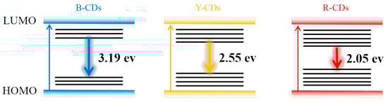 The energy gaps of the B-, Y-, and R-CDs were calculated using the formula Egopt = 1240/λedge, in which λedge is the maximum absorption edge wavelength. The HOMO–LUMO energy gaps of the B-, Y-, and R-CDs (Figure 6) were calculated as 3.19, 2.55, and 2.05 eV, respectively, corresponding to the redshift in the emission wavelength. This result was in accordance with the increase in the graphitic-N content.
