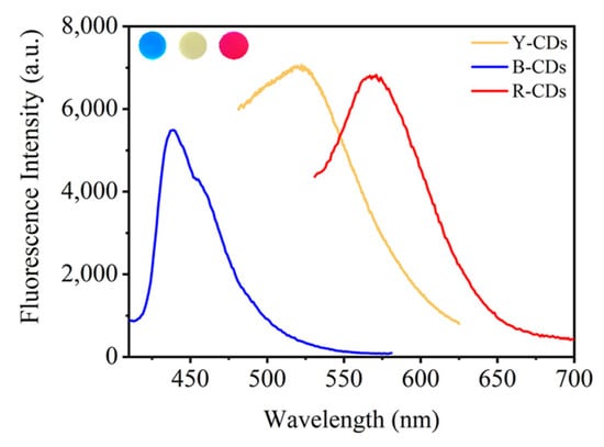 The optimal excitation and emission wavelength of B-, Y-, and R-CDs (Figure 4b) were 370/440 nm, 430/530 nm, and 520/580 nm, respectively. The optimal excitation wavelengths of these three CDs were basically consistent with their corresponding absorption bands, indicating that the emission mainly acted on the absorption bands from the n–π* transition of the C=O and C=N bonds of the aromatic sp2 system.