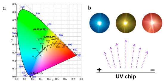 Multicolor CDs can be applied in the fields of biological imaging [4,9], sensing [20], and anti-counterfeiting [21]. Light-emitting diodes (LEDs), which are widely used in industrial production, manufacturing, and in households, have attracted great attention recently because of their long life, low power dissipation, small size, and high current-to-light efficiency [22,23,24,25]. More recently, multicolor carbon dots have emerged as promising candidates for LED applications due to their low toxicity, stability, and ease of preparation [17,19,26,27,28]. However, it is urgent to prevent solid quenching caused by π–π aggregation. Moreover, long wavelength emission, especially in red emissive carbon dots, is still a key challenge. It is of vital importance to seek appropriate carbon precursors, surface functionalization methods and preparation methods that are simple and systematic, in order to obtain multicolor carbon dots.