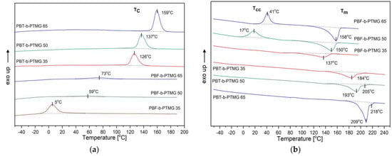 The DSC traces for PBF-b-PTMG copolymers reveal significant differences in the crystallization process when compared to PBT materials with the same flexible segment contents. First, a considerable supercooling from the melt is required for the exothermal effects (Tc) to appear within 5–73 °C range, though they are very weak (Figure 4a). Furthermore, the highest crystallization enthalpy, ∆Hc, is observed for the copolymer with the smallest content of the rigid segment, which contrasts with PBT copolymers observations. When samples are subjected to a second heating cycle (Figure 4b), the PBF-b-PTMG 50 and 65 materials undergo cold crystallization with Tcc at 17 °C and 41 °C, respectively (thus the crystalline hard phase is further developed), and the melting temperatures are detected within 150–158 °C. In the case of PBF-b-PTMG 35, the Tcc does not appear, so the sample can be considered fully crystallized, and its melting point is observed at 137 °C. When explaining such behavior by the PBF copolymers, it should be noted that in multiphase materials the critical factor is which phase plays a role of the continuous matrix, thus dominating in the microstructure. In block copolymers, in general, flexible segments increase the mobility of the macromolecules, which facilitates their folding [5,6]. However, the DSC results prove that in furan–ester copolymers the rigid segments are so stiff due to their specific architecture, which, when dominating in the macromolecules, mutually restricts their mobility. It also restricts their diffusion, necessary in crystallization process.