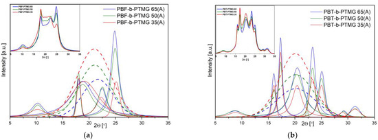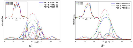 WAXS patterns of injection molded samples after deconvolution to crystalline peaks and amorphous halo for (a) PBT-b-PTMG and (b) PBF-b-PTMG copolymers (the original data presented in boxes). The spectra received after two days from processing. The amorphous halo peaks are in dash line.