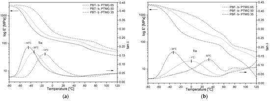 The storage modulus E’ and tan δ profiles for (a) PBT-b-PTMG and (b) PBF-b-PTMG copolymers.