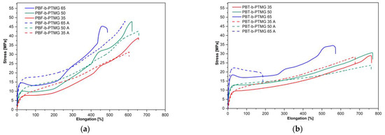 The representative uniaxial stress-strain plots of (a) PBF-b-PTMG and (b) PBT-b-PTMG copolymers after one month of storage and after annealing (A).