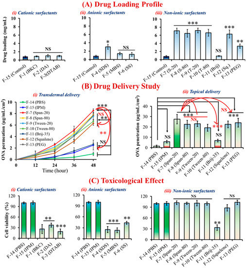 The hydrophobic tails and hydrophilic heads of nonionic surfactants allow drug molecules to dissolve in the oil phase, thereby improving stability and biocompatibility. Furthermore, cationic and anionic surfactants carry positive and negative charges in a medium, respectively, causing damage to the cell membrane or a toxic effect and resulting in reduced cell viability. The safety of a new surfactant must be demonstrated in nonclinical and clinical studies according to U.S. FDA guidelines, especially when dealing with pharmaceutical formulations [35]. No-ionic ILNDFs were associated with greater cell viability in skin irritation tests using the LabCyte EPI model cell line, whereas both cationic and anionic ILNDFs had toxic effects. Cell viability was significantly reduced (p < 0.01) when PBS solutions were compared with BKC-, DA-, SS-, Brij-35–, DTAB-, SDS-, and MBS-based ILNDFs; however, S-20-, S-80-, T-20-, T-80-, squalene-, and PEG-based ILNDFs were biocompatible (Figure 2C).