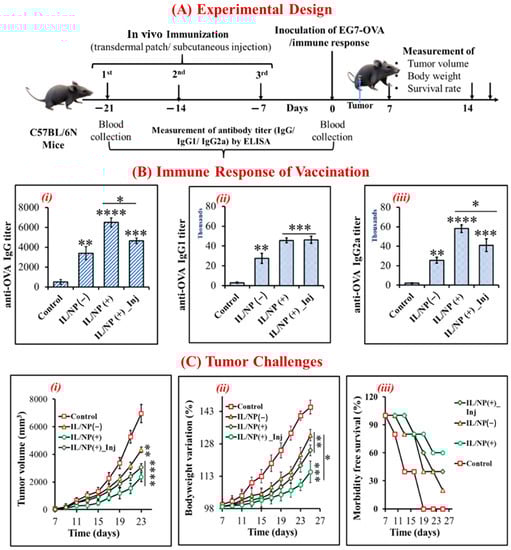 Prophylactic effect of the nanovaccine. (A) The experimental approach for vaccination in C57BL/6N mice. (B) OVA-specific IgG immune response to nanovaccination: (i) total IgG, (ii) IgG1, and (iii) IgG2a. (C) Antitumor effect of the nanovaccine on (i) tumor growth and development, (ii) body weight variation, and (iii) survival. Data are presented as the mean ± SD (n = 5). * p < 0.1, ** p < 0.01, *** p < 0.001, and **** p < 0.0001.