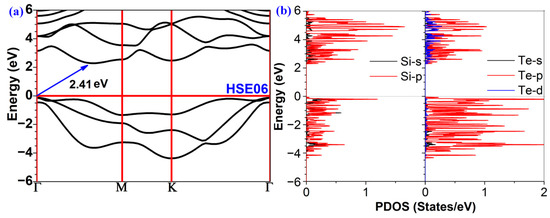 The band structure is a significant factor that regulates the photocatalytic activity of a material. The band gap of a photocatalyst should be noteworthy. As shown in Figure 2a, our first principle calculations revealed that the valence band maximum (VBM) of 2D polar monolayer SiTe is at the Γ point. The conduction band minimum (CBM), on the other hand, is situated between the Γ and M points, indicating that 2D polar monolayer SiTe is an indirect semiconductor. Moreover, the band gap of 2D polar monolayer SiTe is 2.41 eV, calculated using the HSE06 functional. This result suggests that ultraviolet light and visible light can be efficiently absorbed by 2D polar monolayer SiTe. As shown in Figure 2b, the VBM of the partial density of states (PDOS) is below the Fermi energy level and is principally provided by the p orbitals of Te and Si atoms, whereas the CBM above the Fermi energy level is primarily provided by the p orbitals of Si atoms. The band gap shown in the PDOS is consistent with that shown in the band structure.
