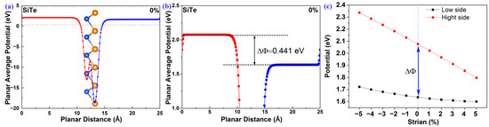 Figure 4. (a) The planar average potential of 2D polar monolayer SiTe; (b) an enlarged section of (a); (c) the surface potential difference (ΔΦ) of 2D polar monolayer SiTe at different strains.