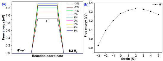 Figure 6. (a) The Gibbs free energy changes of HER at different strains; (b) the trend of ΔG at different strains.