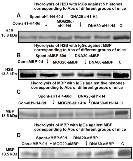 The catalytic cross-activity of any Abs-Abzs against various proteins was recently described [,,,,,]. It was shown that polyclonal auto-IgGs of HIV-infected patients against MBP specifically hydrolyzed MBP and five H1-H4 histones and vice versa—total preparations of abzymes against the five histones effectively degraded MBP [,]. Recently, IgGs against five histones and MBP corresponding to different stages of EAE development, including spontaneous EAE, MOG- and DNA-histone complex-accelerated onset, acute, and remission stages in C57BL/6 mice were analyzed []. Such IgG-abzymes against five histones and MBP demonstrated unusual polyreactivity in complex formation and enzymatic cross-reactivity in the hydrolysis of H4 histone. These chimeric abzymes with cross-catalytic reactivity could be very hazardous for the development of many AIDs since Abzs against five histones can also hydrolyze MBP of nerve tissue shells [,]. It seemed interesting to what extent the phenomenon of enzymatic cross-reactivity between Abzs against histones and MBP is common in humans and animals with different AIDs. In addition, it was important to understand whether there is unusual enzymatic cross-reactivity of Abs-Abzs against histones and MBP only in the case of H4 or also for other histones. Moreover, the analysis of abzymes corresponding to different stages of EAE development in C57BL/6 mice can allow an understanding of how the relative activities of abzymes and their substrate specificity concerning individual histones and MBP can change depending on the stage of pathology.