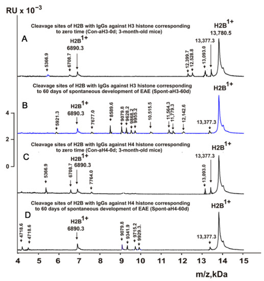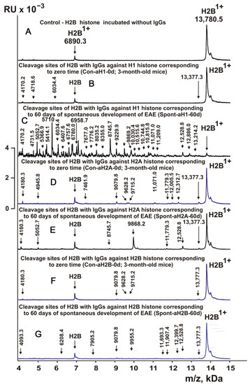 In this work, IgGs from mice corresponding to individual histones and MBP and corresponding to different stages of EAE development (Table 1) were first used to study their enzymatic cross-reactivity in the hydrolysis of H2B histone. The cleavage sites of H2B were identified by MALDI mass spectrometry. After incubation in the absence of IgGs (Figure 2A), H2B histone was almost homogeneous, showing two signals of its one- (m/z = 13,780.5 Da) and two-charged ions (m/z = 6990.3 Da). First, H2B hydrolysis sites were identified using IgGs against three individual histones corresponding to the zero time of the experiment (3-month-old mice) and the spontaneous development of EAE during 60 days (without mouse immunization). For all IgG preparations against individual histones listed in Table 1, 8–10 spectra were obtained. Several typical spectra are shown in Figure 2. Each preparation of IgGs demonstrated a specific set of peaks corresponding to the hydrolysis of H2B histone.