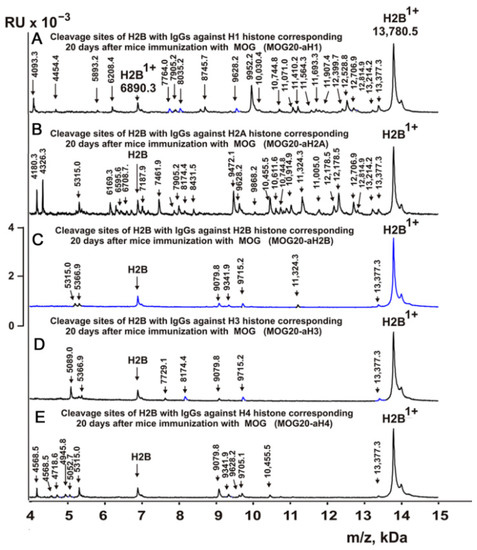 MALDI spectra of H2B (0.9 mg/mL) hydrolysis products with IgGs against the five histones corresponding to 20 days after mouse immunization with MOG: MOG20-aH1 (A), MOG20-aH2A (B), MOG20-aH2B (C), MOG20-aH3 (D), and MOG20-aH4 (E). All designations of IgG preparations and values of m/z are shown in the figure.