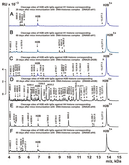 MALDI spectra of H2B (0.9 mg/mL) hydrolysis products with IgGs against three histones corresponding to 20 and 60 days after mouse immunization with DNA-histone complex: DNA20-aH1 (A), DNA60-aH1 (B), DNA20-aH2A (C), DNA60-aH2A (D), DNA20-aH2B (E), and DNA60-aH2B (F). All designations of IgG preparations and values of m/z are shown in the figure.