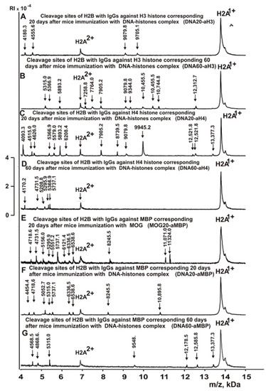 MALDI spectra of H2B (0.9 mg/mL) hydrolysis products with IgGs against two histones and MBP corresponding to 20 and 60 days after mouse immunization with DNA-histone complex: DNA20-aH3 (A), DNA60-aH3 (B), DNA20-aH4 (C), DNA60-aH4 (D), MOG20-aMBP (E), DNA20-aMBP (F), and DNA60-aMBP (G). All designations of IgG preparations and the values of m/z are shown in the Figure.