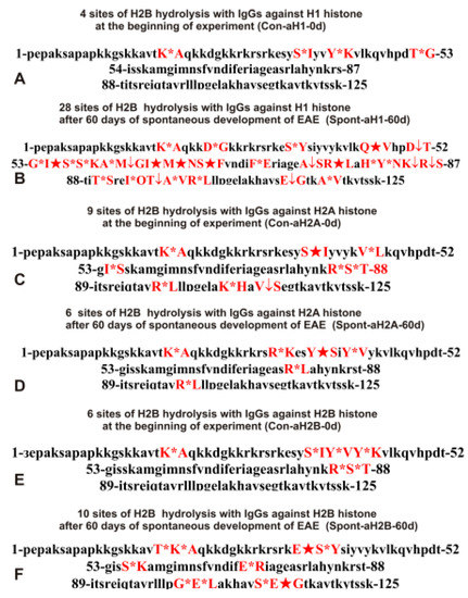Thus, during the spontaneous development of EAE, there may be expansion or constriction of the repertoire of lymphocytes producing abzymes with completely different properties compared to the beginning of EAE. Interestingly, the pools of antibodies against the five H1-H4 histones contained IgGs hydrolyzing H2B at the same sites as Abs corresponding to zero time but with more or less efficiency in the splitting this histone or hydrolyzing H2B at completely different sites.