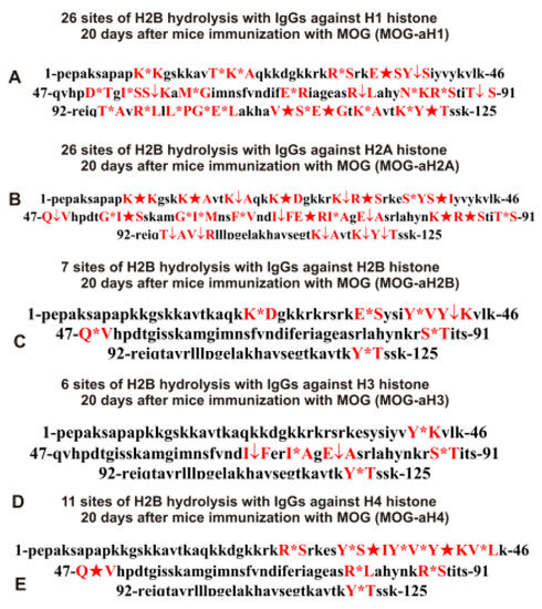 Previously, catalytic cross-reactivity was shown using the example of total antibodies against five histones from the blood of HIV-infected patients and IgGs against MBP [,]. Recently, we analyzed the possible enzymatic cross-reactivity of total IgGs of C57BL/6 mice against five histones (isolated using Sepharose containing five immobilized histones) and MBP in the hydrolysis of H4 histone []. The results showed that the treatment of mice with MOG and DNA-histone complex resulted in the hydrolysis of H4 histones at different sites. In addition, the sites of H4 histone hydrolysis by IgGs against the five histones and MBP significantly changed depending on the stage of development of EAE, including onset, the acute phase, and remission stage.
