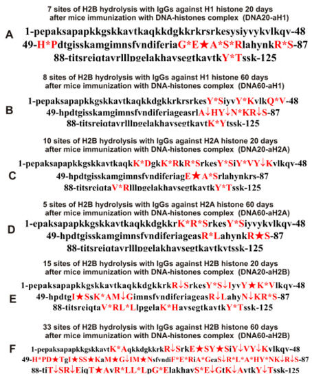 Sites of H2B hydrolysis by IgGs against three individual H1-H2B histones corresponding to 20 and 60 days after mouse immunization with DNA-histone complex: DNA20-aH1 (A), DNA60-aH1 (B), DNA20-aH2A (C), DNA60-aH2A (D), DNA20-aH2B (E), and DNA60-aH2B (F). Major sites of H2A cleavage are shown by stars (★), moderate sites by arrows (↓), and minor sites of cleavage by small stars (*).