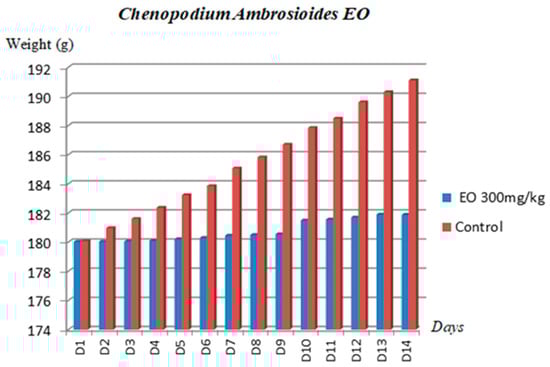 The parameters determined during the observation period for the duration of 14 days showed that at the dose 300 mg/kg, the rats treated with the essential oil of Chenopodium ambrosioides manifested signs of sedation; their movements were reduced during the first hours after injection but they did not present a staggering gait or contractions.
