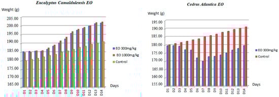 The acute toxicity study of the three essential oils was evaluated on adult female rats according to the Organization for Economic Cooperation and Development (OECD) guidelines 423 [74,75,76,77,78,79,80,81,82]. Before starting the experiment, the rats were deprived of food for 3–4 h. The weight of the animals was measured to determine the dose to be administered by gavage and to form the 4 groups, each of which consisted of 6 rats; the first group received the dose of 300 mg/kg, the second received 1000 mg/kg, the third received 2000 mg/kg and the fourth group was the control, which received only the table oil. This was applied to all three essential oils. After administration of the EOs, signs of toxicity, mortality and behavioral symptoms (respiration, convulsions, food and water intake) were recorded for each group during the first hour after gavage and at the end of the experiment, i.e., after day 14. The body weight of the animals was also measured every day during the experiment. At the end of the experiment, the 50% lethal dose (LD50) was determined according to the protocol described in the OECD guidelines 423 [74].