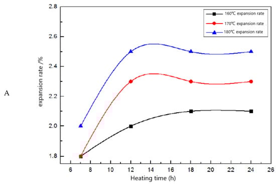 Li. [67] used sodium styrene sulfonate (SSS) and 2-Acrylamide-2-methylpropanesulfonic acid (AMPS) as raw materials, by introducing sulfonic acid group (-HSO3) to improve the temperature resistance of the product, and developed high-temperature-resistant water absorption resin sealant. The expansion properties show that the gel has good expansion and the expansion rate becomes more extensive with the increase in temperature (Figure 2A). After heating at 180 °C for 12 h, the expansion rate can reach 2.5 times. If the heating is continued, the expansion rate of the gel will remain at approximately the same value. This indicates that the gel is able to maintain good expansion under high temperature conditions. The gel can be formed after heating at 180 °C for 2.5 h. After 20 days of continuous heating, the gel still has good stability. This is because the network structure of the plugging agent becomes denser with the addition of AMPS. After introducing -HSO3 into the molecular chain, the two groups (AMPS, -HSO3) cooperate with the temperature resistance, so the thermal stability of the plugging agent is significantly improved.